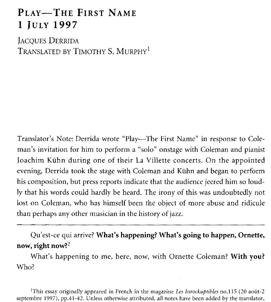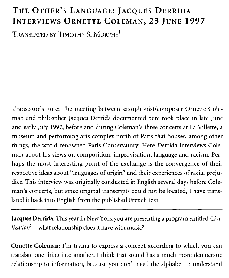Derrida expanded the concept of language and claims that the written word is stronger than the improvised spoken line. Here he meets with Ornette who, despite of being a famous jazz improviser, claims that written musical compositions better serve his intentions as descibed in the concept of Harmolodics.