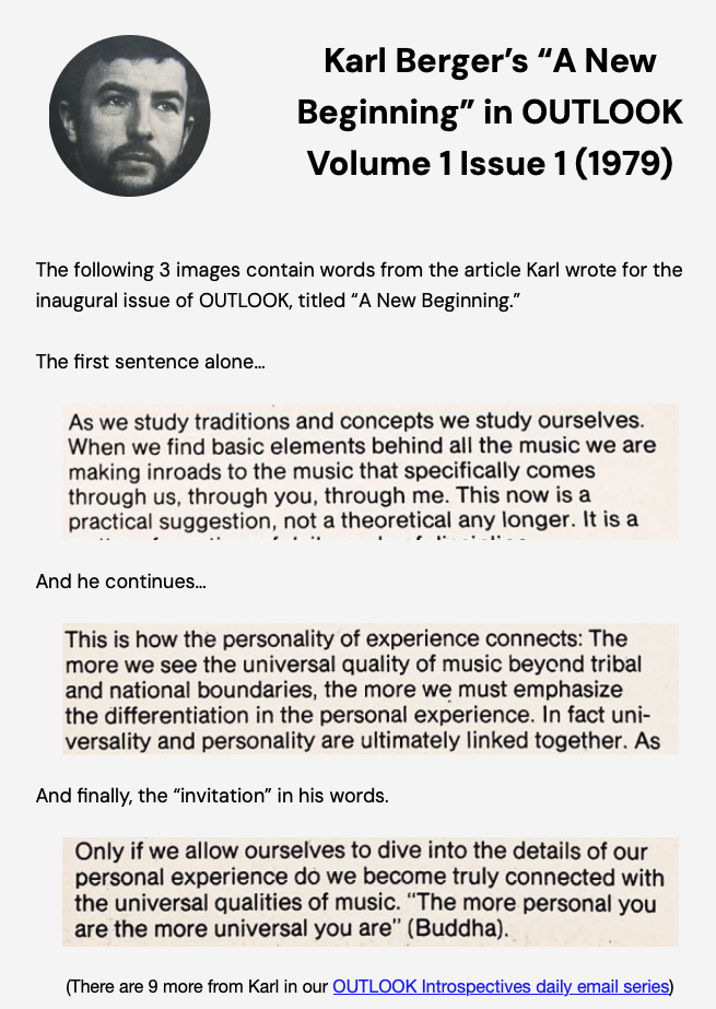 Here are a few statements by Karl he wrote for OUTLOOK, a paper published by the Creative Music Studio, full editions and much more are available at the studio‘s new website.