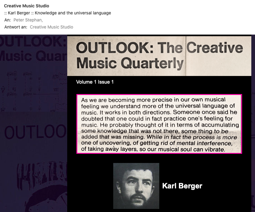 German Radio Station NDR 2010 On the occasion of Karl Berger´s 75th birthday former student Peter Friedrich Stephan speaks about the Creative Music Studio in the 1980ties with Michael Laages for german radio station NDR Info (contains snippets of Basic Practise Class with Karl and Ingrid Sertso´s Gamala Taki).