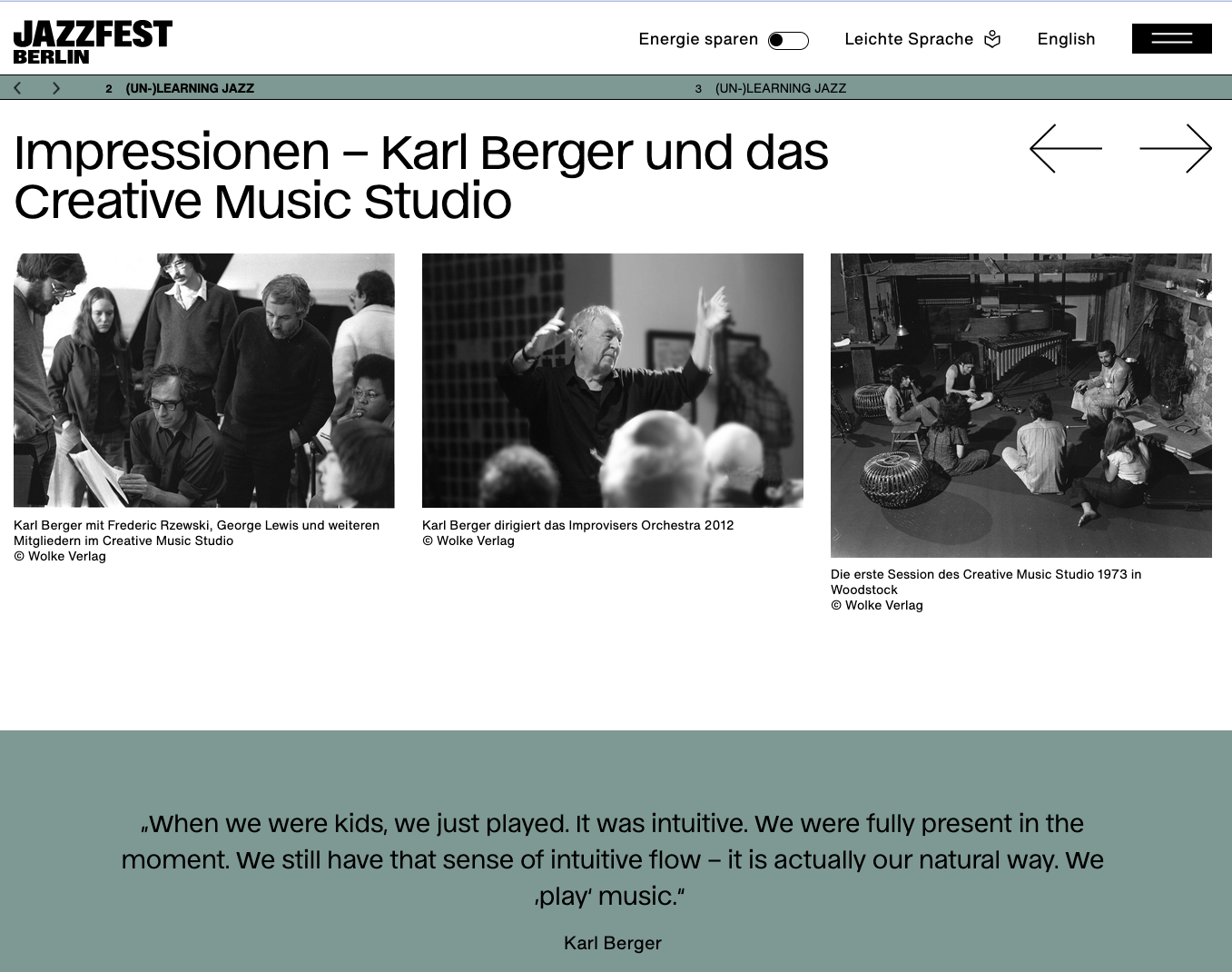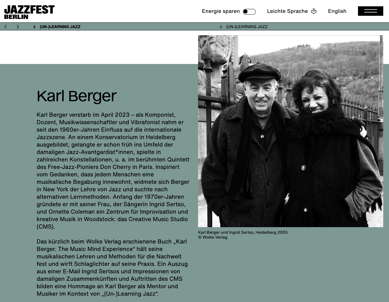 German Radio Station NDR 2013 Report on a CMS Workshop October 7-11, 2013 by Peter Friedrich Stephan, contains interview snippets with founder, pianist und vibraphonist Karl Berger on music mind, beat for beat attention, dynamics, timing, tuning und jazz education.